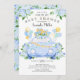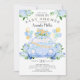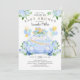 Kör med babyduschdesign med en blå bil med presenter, ballonger och söt blå blombukett. Vänd över inbjudan för att visa en samordnande blommigt tillbaka för en speciell beröring i extra.