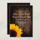 Inbjudningar för bröllop för damastast solros för vintage bleknade lantliga med en wood bakgrund för mörk ladugård och ett damastast mönster för vintage in i trät. De lägre tränga någon har en härlig ljus gult- och bruntsolros. Dessa är underbara för westerna bröllop för land, vintage bröllop och för någon som älskar solrosor.