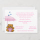 Söt inbjudan för bebisstänkdusch. Tecknaddiagram av en brun nalle, i rosa overaller och innehav ett rosa paraply, dekorerar den nedersta vänster sida av denna vitinbjudan. Diagram av tre regnar tappar faller överst av paraplyet. Text i rosor är klar att personifiera för din baby showerhändelse. Älskvärd inbjudan mamman att vara ska spara för någonsin, med henne nyfödd bebis minnessaker.