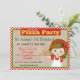 Den iklädda gulliga flickan ett förkläde rymmer en pizza. Underbar för ett pizzaparty i ditt hus eller på en eatery. Ändra text till kostymen. Diagram- & design© Karyn Taglia