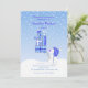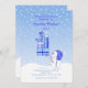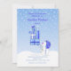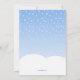 En wintry inbjudan att festa! Blått- och vitkortet presenterar fallande snö och en förtjusande snögubbe som ha på sig en skidahatt och bär en hög av presenter.