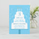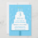 En blåttinbjudan med ballonger och en vittårta med tände stearinljus. Texten visar insida utrymmet av tårtan för en roligt och en informativ inbjudan. Bakgrunden på bekläda av kortet har ett blåttrandmönster.