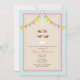 En födelsedagsfest inbjudan med en illustration av ett tiered stativ två av franska macarons på bästa. Inbjudan presenterar också heltäckande- och ginghambunting på bästa och en blåttginghambakgrund. Personifiera texten med specificerar av ditt tillfälle.