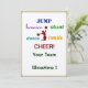 Detta inbjudankort presenterar en silhouette av en hejaklacksledare i mittet av hoppet omgiven collage av det ordhoppet, dunet, dansen, jippot, fall och jubel i blått, grönt, rött och gult/orangen. Det finns också en placeholder för din text - ditt namn, ditt hejaklacksledarelag eller ett befordrings- meddelande.