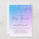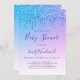 Den här inbjudan till babyduschen i trendiget innehåller en gräns av glatt droppande faux glitter på en ombre regnbåge i nyanser av blått, lila och rosa. Ord "Baby Shower" och namn i mamma som ska visas i handskriftsskriptet för mörk lila, med den återstående texten i mörk lila sans serif font.
