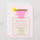 En inbjudan för teapartyfödelsedag som presenterar en rosa färgintrig. Illustration av en rosa tekopp med citronkilen på bästa. Bakgrund på båda sidor är ljus - rosor med rosa polka dots. Personifiera den rosa och svart texten med specificerar av ditt tillfälle.