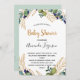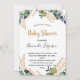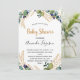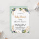 För en babyskor. En vit chic bakgrund. Dekorerad med eukalyptus grenery och guldsprit, lövning. Anpassa och lägg till information om namn och party. Svarta och gyllene brev. Texten: Baby Shower och namn i mamma som ska skrivas med ett modernt handskript i stil. Bakåt: gröntens bakgrund färg