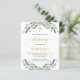 En vit bakgrund som dekoreras med lavender-blommor och eukalyptus grey. Personalisera och en namn och ceremonidetaljer. Svart och guldfärgad färgad brev.