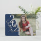 Klass 2021: Blåinbjudan och inbjudan till silver studenten med foto och redigerbar studentfest eller startinformation på baksidan. Anpassa med eget foto, egen text och eget teckensnitt i stil.