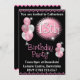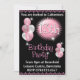 Inbjudan till 13-årsfest med ballonger. Rosa och svart färgschema.
