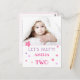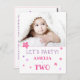 Inbjudningskort till 2-års födelsedagsfest för flicka eller pojke. Sött foto andra födelsedagskort. Kortet har söta rosa stjärnor på framsidan och baksidan. Designen har ett foto - infoga ditt foto i mallen och anpassa kortet med dina detaljer. Bjud in din familj och vänner till din flicka eller pojkes andra födelsedagsfest.