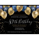 Eleganta falska röda och gyllene glitterballonger på den övre kanten. All text är justerbar och lätt att ändra för dina egna festbehov. Stor elegant födelsedagsfest mall design. vilket år som helst, ålder kan ändras
