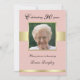 Den här 90:e födelsedagsinbjudan är mycket elegant. Utformningen visar hennes foto som högdager med en gyllene ram på ro guld. Golden-banden visas på båda sidor om ram. Dessutom visas ett gyllene band längs grund. På motsatt sida kan du placera all din inbjudan på en gyllene bakgrund. Copyright henishouseofpaper