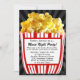 En stor påse popcorn, märkt med din anpassningsbar. Fantastisk Movie Night Party Anpassningsbar Bjuder in i svart, vitt, gult och rött. Röd och vit strimlad popcorn-ruta med popcorn-gult och svartvit ljusstråle i bakgrunden Anpassa maj-popcorn med party-info. Gör en underbar, unik festinbjudan till födelsedagspojken, tjejen eller tillfälle!