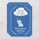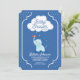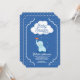 En beundransvärd duschinbjudan från pojke som visar en liten elefant som håller ett paraply mot en dusch av kärlek. Den blå bakgrunden har vit polka dots.<a href="https://www.freepik.com/free-vector/baby-shower-invitation-with-elephant-in-hand-drawn-style_1892948.htm">Designad av Freepik</a>).