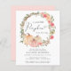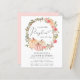 En elegant och snygg budgetvänlig inbjudan till baby shower för en babyflicka med texten "en söt liten pumpa är på väg" skriven i en mix av modern, mjuk grå typografi och ett vackert skrivsätt med ett hjärtsvans, samt en krans av pastellrosa och korallfärgade pumpor och akvarellblommor. Anpassa enkelt mammas namn och detaljer om baby shower i en enkel, grå typografi.