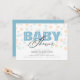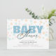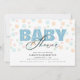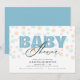 Den här inbjudan till babyduschen är perfekt för ett pojke. Utformningen ger ett modernt utseende där ord "baby" visas i ljusblått och bakgrunden är en punkt mönster i mjuk pastellform färg.