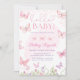 Hej baby rosa-fjäril-inbjudan. Vackra rosa- och lila fjädrar med ord hej baby som flyger omkring.