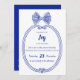 En blå vapensköld med ett hand plockade-band överst är det viktigaste i denna inbjudan till babydusch. Vapenskölden är öppen och visar information om babyduschhändelser på insidan.. Bandet är bundet i en båge överst på vapenskölden. Lägg till mer information på baksidan med vit utskrift och glatt blå bakgrund. Anpassa all information med ett enkelt klick.