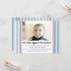Perfektens fotoinbjudan till din lilla nybörjare på deras första födelsedag! Anpassa med ett foto och din information om party. Har blått och vitt streck, röd och blå text och röd baseboll.
