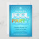 Roligt, livfull bassäng-fest. Coola, bjuda in blå bakgrund med sol, strålar och vinkarare inslag. Ljusa flernydiga slår av färg i party i ord. Anpassa med din egen text med specifik information om din samling. Ljusa, festila sommartemat bassäng bash inbjudan.