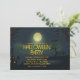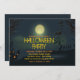 Inbjudan till Halloween fest har ett hemsökt hus, fladdermus, läskigt träd, ett brutet stängsel och en blek måne med närmare uppgifter om party i roligt typsnitt.
