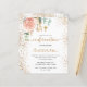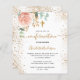 En vit bakgrund som dekoreras med eukalyptus greenery, ro guld och rosa ros, och guldlöv och faux-glitter droppar från guld. Personalisera och en namn och ceremonidetaljer. Svart och guldfärgad färgad brev. Baksida: vit bakgrund med droppar av guldfaux glitter