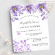 På framsidan: En vit bakgrund med violett, lilac violet klänning och blommigtar. Namn är skrivet med ett modernt handskript i stil. Anpassa och lägg till information om namn och party. Tips! Om du inte vill att det ska se ut som ett vykort klickar du på anpassa, går till baksidan och tar bort delaren och lägger till frimärke.