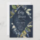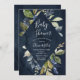 Botaniskt babyskor inbjuds att rama in inbjudningsinformationen med gräns av vattenfärgsfärgade löv, blåa blommor och grönt löv på vattenfärgsflottans bakgrund.