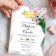Den rosa bakgrunden åtföljs av en guldbokstavad script-design som säger "You're Cordially Invited" utan någon ram runt omkring. Dekorationen på höger kant av bakgrunden är min jämna, mjuka, måleriska illustration av en glaskrukva med vita och rosa rosor inuti. Inbjudan är anpassad för att du ska kunna skriva in din personliga information. All min konst, som inkluderar bakgrunder, bokstavskonst och ramar, är stolt skapad UTAN AI och UTAN tredjeparts konst. Med andra ord är varje objekt 100% skapat av mig – Christie Taylor.