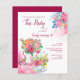 Tea party födelsedagsfest kopp fylld med budgetinbjudan till magenta blommor. Tea party, högtidlig inbjudan till party-födelsedag, traditionell, elegant och vibrerande.