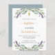 En vit bakgrund som dekoreras med lavender-blommor och eukalyptus grey. Personalisera och en namn och ceremonidetaljer. Svart och guldfärgad färgad brev.