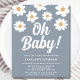 Planerar du en pojkdusch? Den här inbjudan till babyduschen är dekorerad med handritade daisy och Oh Baby! i vit retrotypografi på blå bakgrund. Enkelt anpassade. Teckning © Michele Davies.
