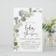 Budgeten Eucalyptus Greenery Succulent Botanical Watercolor Vår Kön Neutral Pojke eller Flicka Baby Shower Inbjudan på vit bakgrund - innehåller vackra och elegant manustypografi med moderna botaniska löv och grön för att speciella Mor ska vara firande.