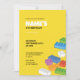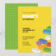 En rolig inbjudan till Byggblocksfest i livfulla färger och med en grön basplattdesign baktill. Perfekt för alla barns födelsedagsfirande med ett bygge tema!