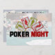 En poker party/kasino-kvällsinbjudan. Framsidan har en blek bakgrund med ett foto av poker chip och har fyra spelkort med sexig silhuett och Poker Night typography. På baksidan finns dina party-detaljer överst på en blek bild av ett spelkort och poker chip på ett spelande bord.