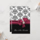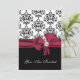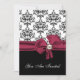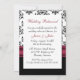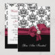Återkallande middagsinbjudan från Elegant bröllop, klar i svart, vitt och burgundi. Bilder av ett vackert svart och vitt dammmönster, överst, och massivt svart, på grund, av inbjudan, med en härlig burgundisk färgad, över mitten, med en pärltittar fruktbar dekoration. Du är inbjuden, i text med vitt skript, på inbjudningens framsida, och svart och grumlig text på baksidan är helt anpassade till kostym som din händelse behöver. En trevlig inbjudan till paret kommer att uppskatta, med alla deras bröllop-minnesmärken.