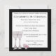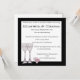 Inbjudan till cocktailbuffé presenterar en fantasifull illustration av Donna Gotlib med två vinglas och rosa blommor i ett litet glas. Det finns en bred svart ram runt inbjudan som är knivskarp vit. Teckensnittet är en rolig och fantasifull kalligrafisk tryckdesign.