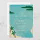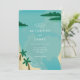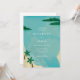 Handmålade handflatan träd, strand och hav utgör en tropisk bakgrund för denna målbröllopsdesign.