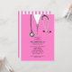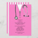 Kreativets medicinska studentfest inbjudan, med av rosa sjukhusskrubbar och stetoskop. Redigera text om du vill skapa unika inbjudningar till doktor-partiet eller medicinska skolbetyg.