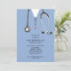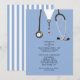Kreativets medicinska studentfest inbjudan med blå sjukhusbuskar och stetoskop. Redigera text om du vill skapa unika inbjudningar till doktor-partiet eller medicinska skolbetyg.