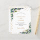 En vit bakgrund som dekorerats med eukalyptus grenery, guldblad och hjärta. Anpassa och lägg till information om namn och bröllop. Svart och guldfärgad färgad brev. Bakåt: vit bakgrund med faux guld-hjärtan sprinklar.
