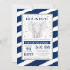 Det är en pojke! De här berömvärda barnduschinbjudningarna är trendig och söta. Den här designen har marinblå diagonalpunkter i rand, prickor i silver glitter och elefantillustrationer. Mönster är platta tryckta illustrationer/grafik - INTE FATUAL GLITTER.