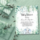 För en babydusch, fira en pojke. En söt liten elefantpojke i baby och eukalyptus grey och grönt gnistor. Anpassa och lägga till uppgifter om namn i mamma till namn och party. Namn och texten: Baby Shower är skrivet med ett handskript i stil