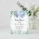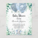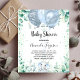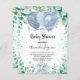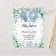 För en babydusch, fira en pojke. En vit bakgrund. Dekorerad med blå ballonger, en söt liten elefantpojke från baby och eukalyptus grey och grönt gnistor. Anpassa och lägga till uppgifter om namn i mamma till namn och party. Namn och texten: Baby Shower är skrivet med ett handskript i stil