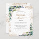 Välkommen till en Möhippa för elegant. En vit chic bakgrund. Dekorerad med grönt vattenfärgade eukalyptus löv, sprickor, grönsak, faux guld löv och gulddamm från glitter. Anpassa och lägg till bridens namn för att vara och paratera detaljer. Svarta och gyllene brev.