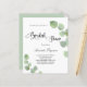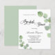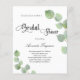 En vit bakgrund som dekorerats med eucalyptus greenery sprigs. Personalisera och namn om bruden som ska vara och närmare uppgifter om party. Bakåt: gröntens bakgrund.