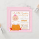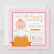 Inbjudan till baby shower med söt liten flicka som sitter på en pumpa på rosa och brun prickig bakgrund. Du kan enkelt anpassa dessa pumpababy shower-inbjudningar för ditt evenemang genom att helt enkelt lägga till dina uppgifter.