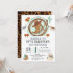 En "sadelmakare upp", söt och vismisk vilda western cowboyinbjudan på Terracotta och blues för en pojke, med westerna cowboyredskap och ranchdjur. Sadelhäst, stut, hästar, kaktus och lasso. Allt en cowboy behöver. Det är hans första rodeo! Baksidan av inbjudan har en skorrig läderbakgrund.