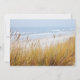 Mall för inbjudan till födelsedagsfest vid havet med sanddyner för män eller kvinnor som älskar havet. Anpassa texten på två platser med stor skrift högst upp - exempel, “Födelsedagsfest”, och tryckt text i blått längst ner. Designen är ett strandfoto med en sandig gång mellan de gräsbevuxna dynerna som leder till ett lugnt hav. Baksidan har också en bild av havsdyner.